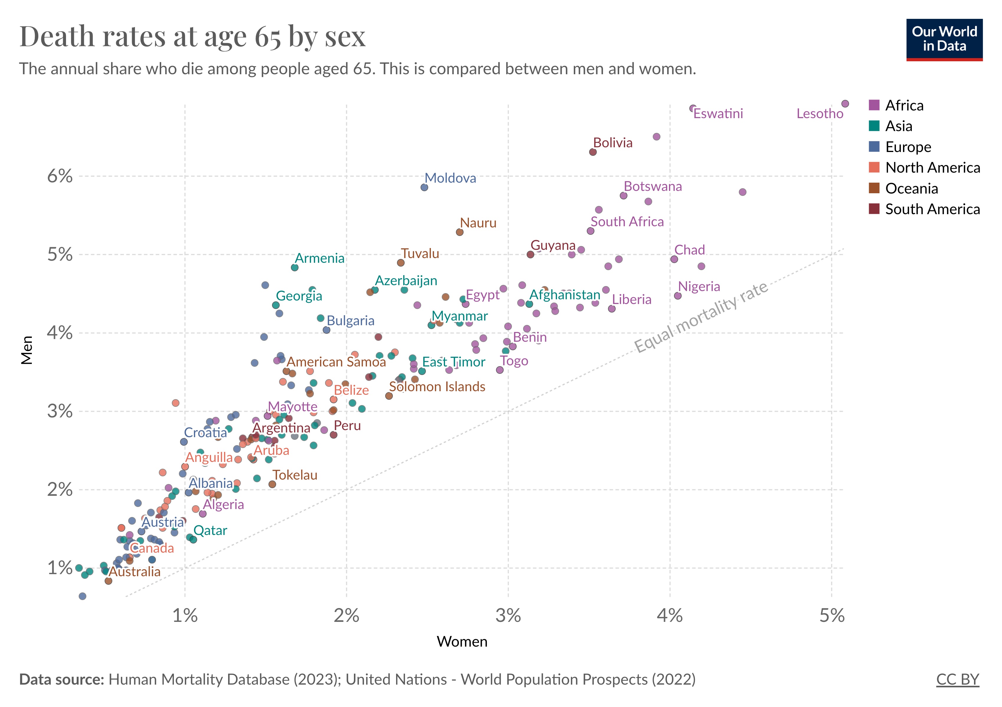 As before, most countries are found above the diagonal line, which means death rates are higher among men.